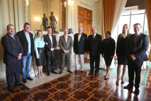 O prefeito Fedoca – João Alfredo de Castilhos Bertolucci (PDT), a secretária de Turismo, Rubia Frizzo, os empreendedores Fabiano Feltrin, Norberto Fernando Herrero, e os irmãos Gabriela e Guilherme Michaelsen, foram recebidos pelo governador José Ivo Sartori (PMDB) no Palácio Piratini, na última quarta-feira (25), quando foi apresentado o projeto de instalação do Hard Rock Café de Gramado.